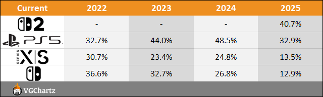 Here we see data showing consumer sales and sales evolution of the four current platforms (Nintendo Switch 2, PlayStation 5, Xbox Series X|S and Nintendo Switch 1) for comparable periods in 2022, 2023, 2024 and 2025. It also shows the market share for each console over the same periods.