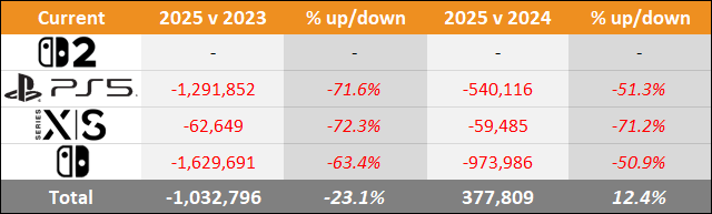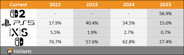 Here we see data presenting sales for consumers and a change in sales performance of four current platforms (Nintendo Switch 2, PlayStation 5, Xbox Series X | S and Nintendo Switch 1) for comparable periods for 2022, 2023, 2024 and 2025. The share of the market for each of the consoles for each of the consoles is also shown the same periods.