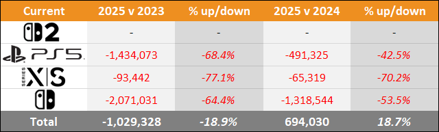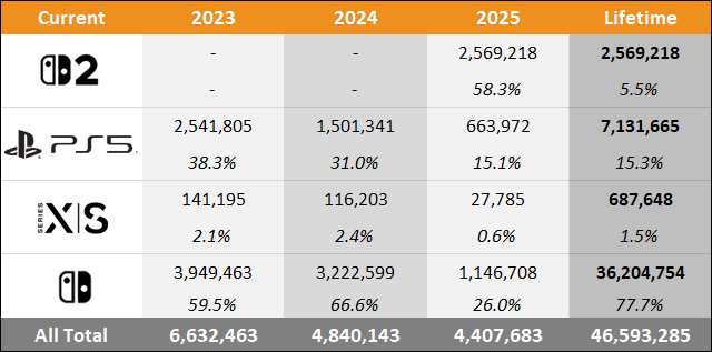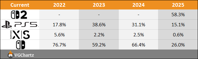 Here we see data showing consumer sales and sales evolution of the four current platforms (Nintendo Switch 2, PlayStation 5, Xbox Series X|S and Nintendo Switch 1) for comparable periods in 2022, 2023, 2024 and 2025. It also shows the market share for each console over the same periods.