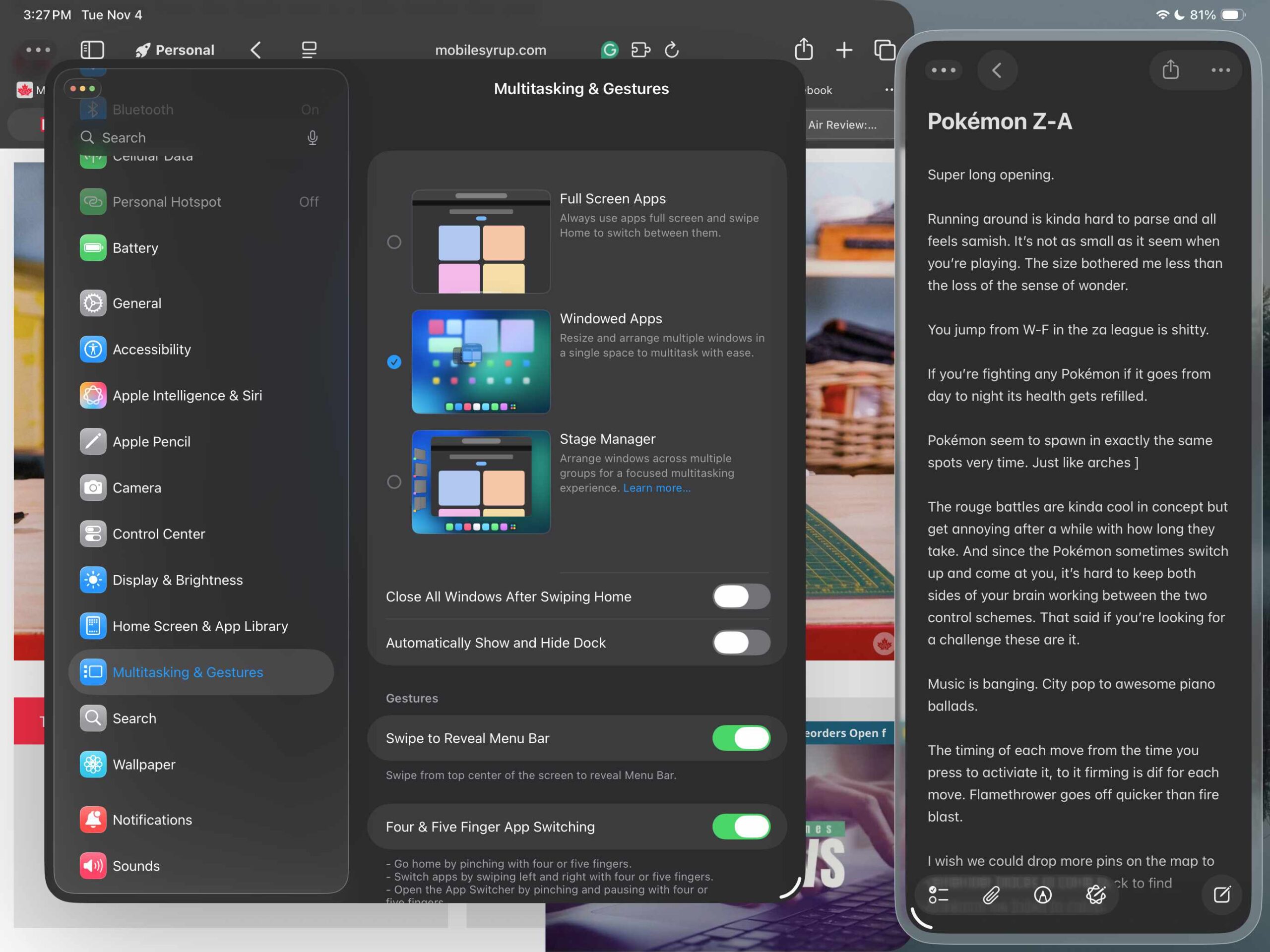 While the new mode offers much more flexibility, if you choose not to use it, you'll lose access to three-app multitasking. Now, thanks to the latest update, you can use this feature, but you need to use Windows Apps or Stage Manager multitasking formats. If you have one of these enabled, you can press and hold the green traffic light button to open the SlideOver option.