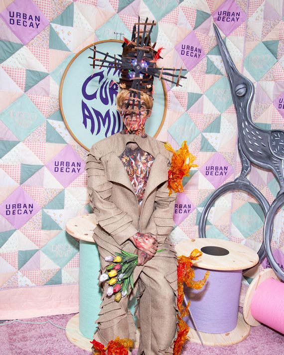 Comedian and party host Julio Torres was a windmill on fire. Technically, the entire windmill is a wig constructed from hair, and the blades are actually turned by a disco ball motor.