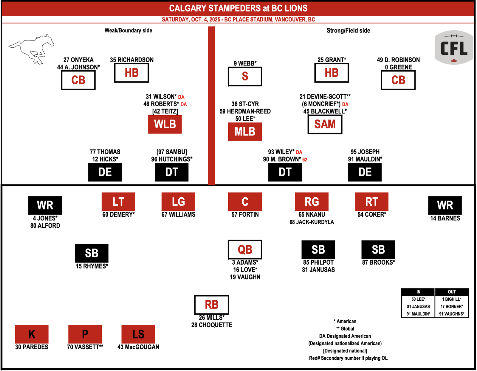 Calgary Stampertys will have a long -standing NFL midfielder Markel Lee in the starting lineup when they visit BC lions on Saturday night.