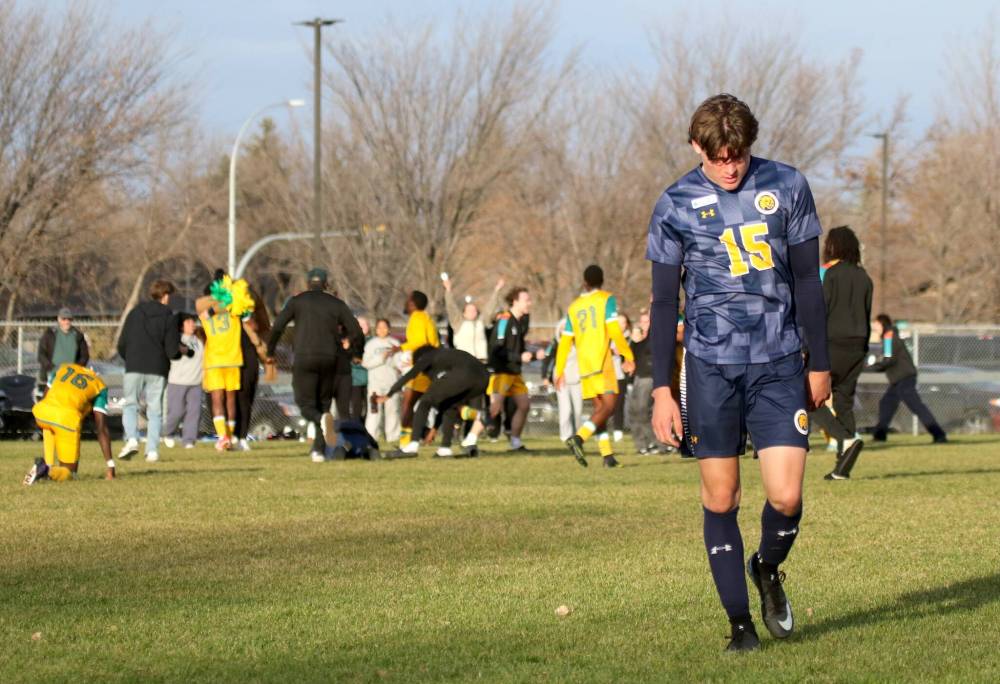 Brandon University's Declan Hoad (15) walks off the field as the CMU Blazers celebrate winning the MCAC Men's Soccer Championship at Healthy Living Center Field on Sunday. (Thomas Friesen/Brandon Sun)