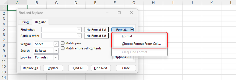 - Select Format from Cell: This is the fastest method. Click it, and then use the eyedropper cursor to select any cell that already has the exact format you want to find.