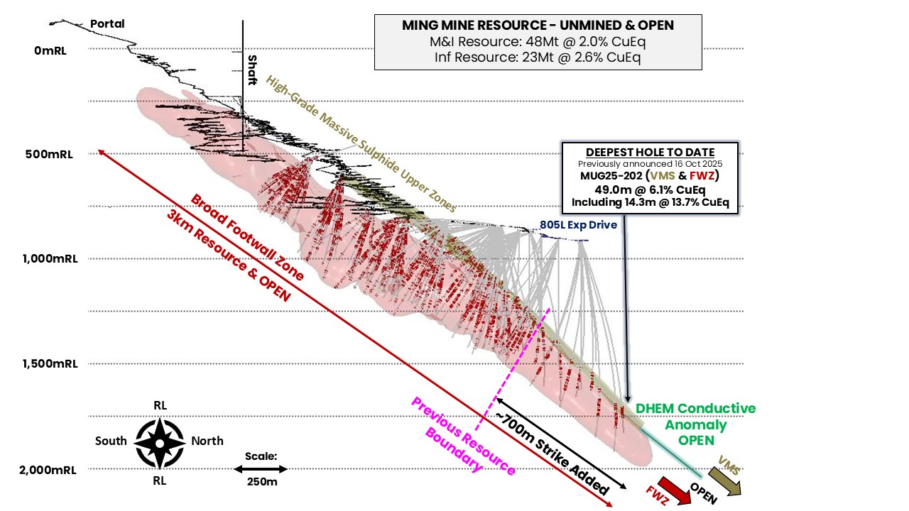 Figure 3: Long section of the Ming Deposit MRE extent and new drilling completed since the previous October 2024 MRE. The MRE remains open and geophysical DHEM conductors indicate the mineralisation likely continues down plunge. Red wireframe is the FWZ mineralisation envelope and gold wireframes are the upper high-grade copper-gold VMS zones. Red on drillholes are assays >0.5% copper.