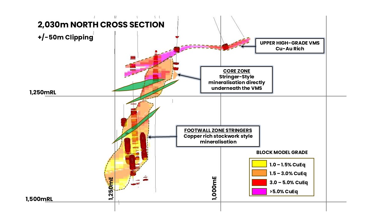 Importantly, the MRE contains a zone of higher-grade material comprised of volcanogenic massive sulphide (VMS) mineralisation plus the recently discovered ‘core zone’ which totals 8.8Mt @ 3.9% CuEq in M&I and a further 10.9Mt @ 3.8% CuEq in the Inferred category.