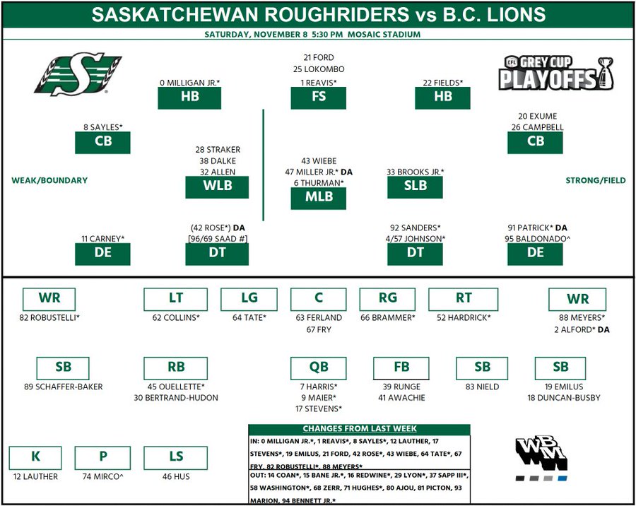However, it's not all good news for Saskatchewan. All-CFL wide receiver KeeSean Johnson will not be able to travel. after being listed as questionable with a knee injury. Canadian pass catcher Ajou Ajou (ankle) was also ruled unavailable, leaving Robustelli, Kian Schaffer-Baker, Tommy Neild, Emilus and Meyers in the starting five, with Del Duncan-Busby as insurance.
