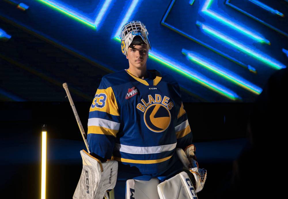 Saskatoon Blades goaltender Ethan McCallum (33) of Brandon is in his third season in the Western Hockey League and second in Bridge City after being traded from the Medicine Hat Tigers. (Steve Hiscock/Saskatoon Blades)