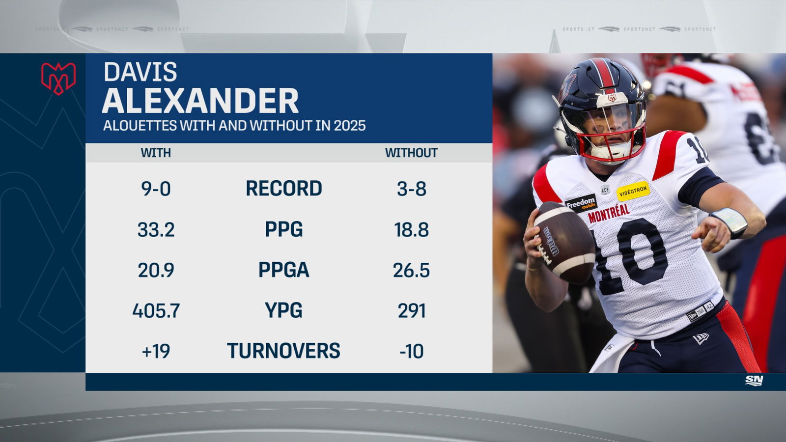 The first came in Week 8 last year in a 20-16 win after entering the game early in the third quarter in Montreal. Alexander completed 15 of 18 passes for 178 yards with two touchdowns and no interceptions in 30 minutes after the Als trailed 16-3 at halftime.