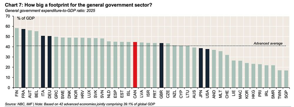 The government in Canada is not small, but it is not the largest either, as an International Monetary Fund comparison shows. Canadian government spending as a share of gross domestic product exceeds the average for developed economies, said National Bank of Canada economist Warren Lovely.
