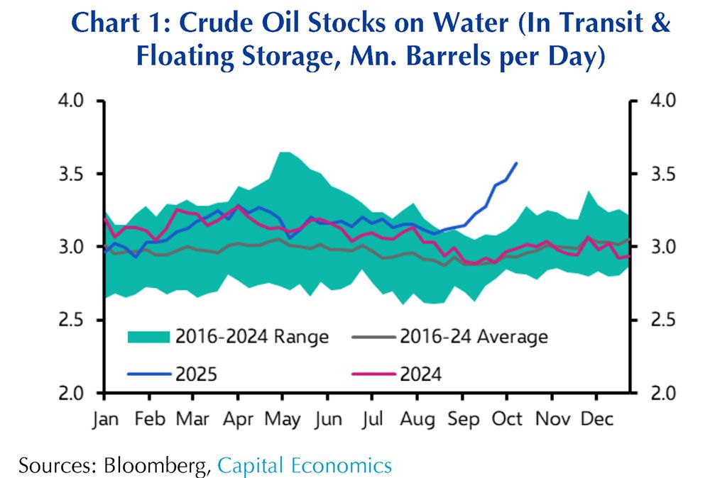 It is estimated that oil reserves currently floating in tankers around the world's oceans amount to 1 billion barrels. The last time there was such a high was during the pandemic, when a price war between Saudi Arabia and Russia sent Brent crude prices soaring to $30 a barrel, Capital Economics said.