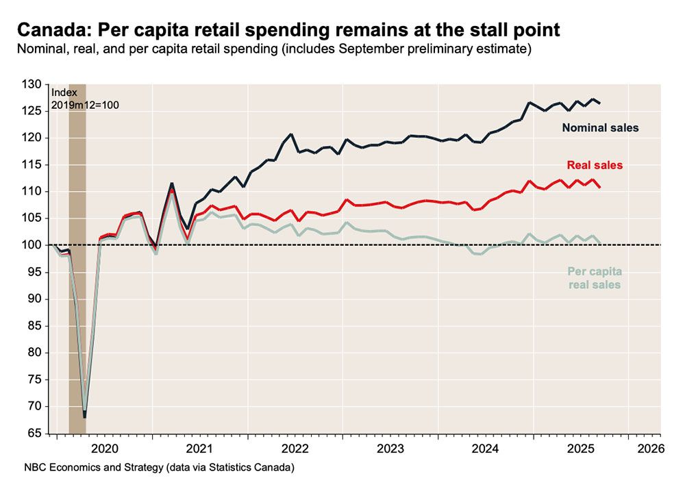 Statistics Canada estimates September sales fell 0.7 per cent, and today's chart shows spending per capita, or per person, has been flat for some time.