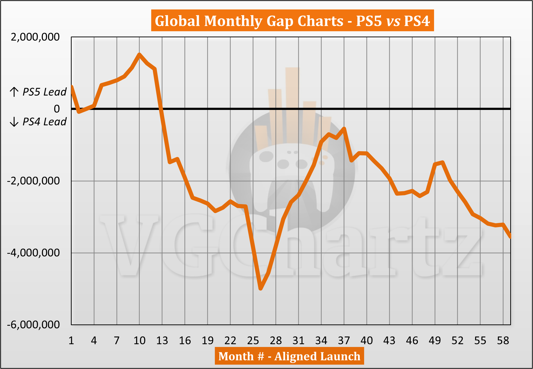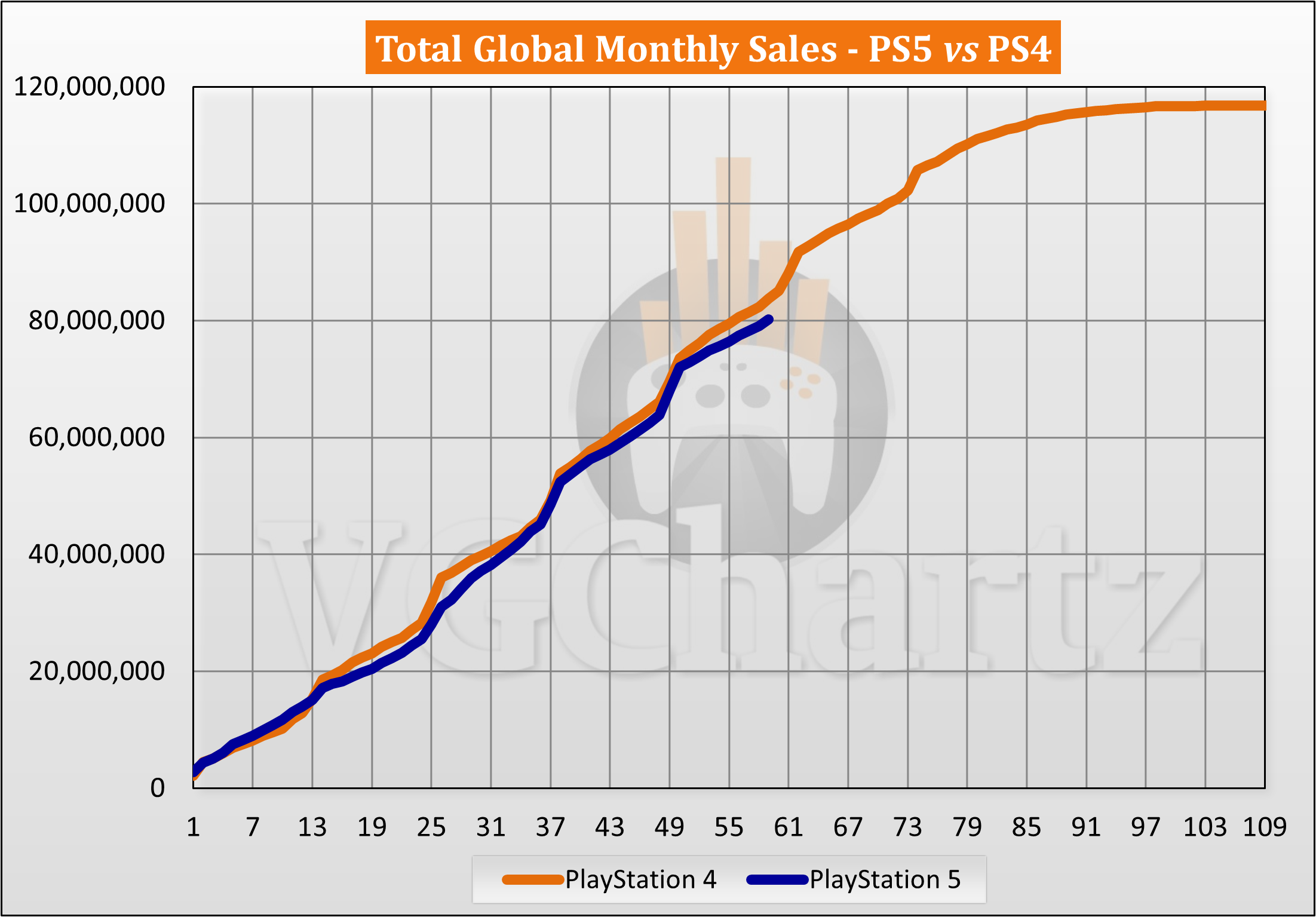 This monthly series compares worldwide sales of PlayStation 5 and PlayStation 4.