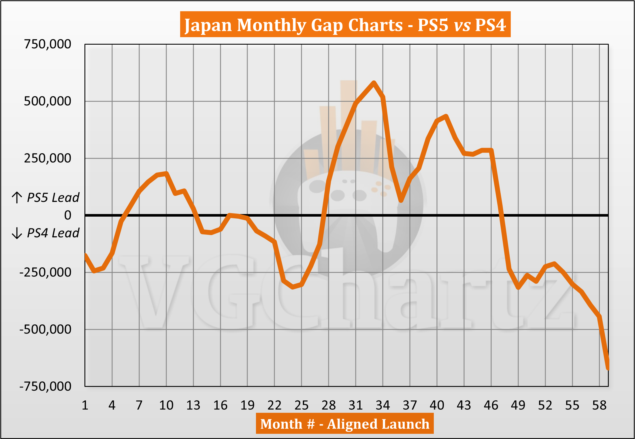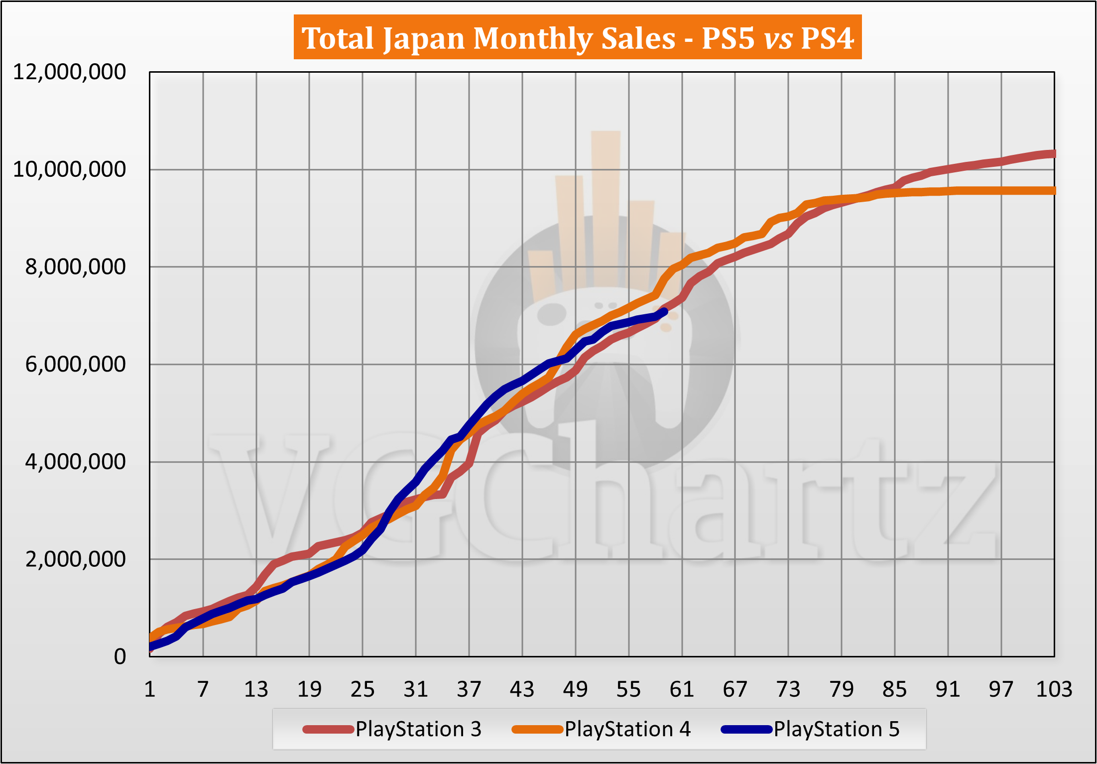 PS4 sales exceeded 8 million in month 61, 8.5 million in month 68, and 9 million in month 72. During the entire sales period, PS4 sold 9.68 million units. PS5 sales in Japan currently lag 2.59 million units behind PS4 total sales.