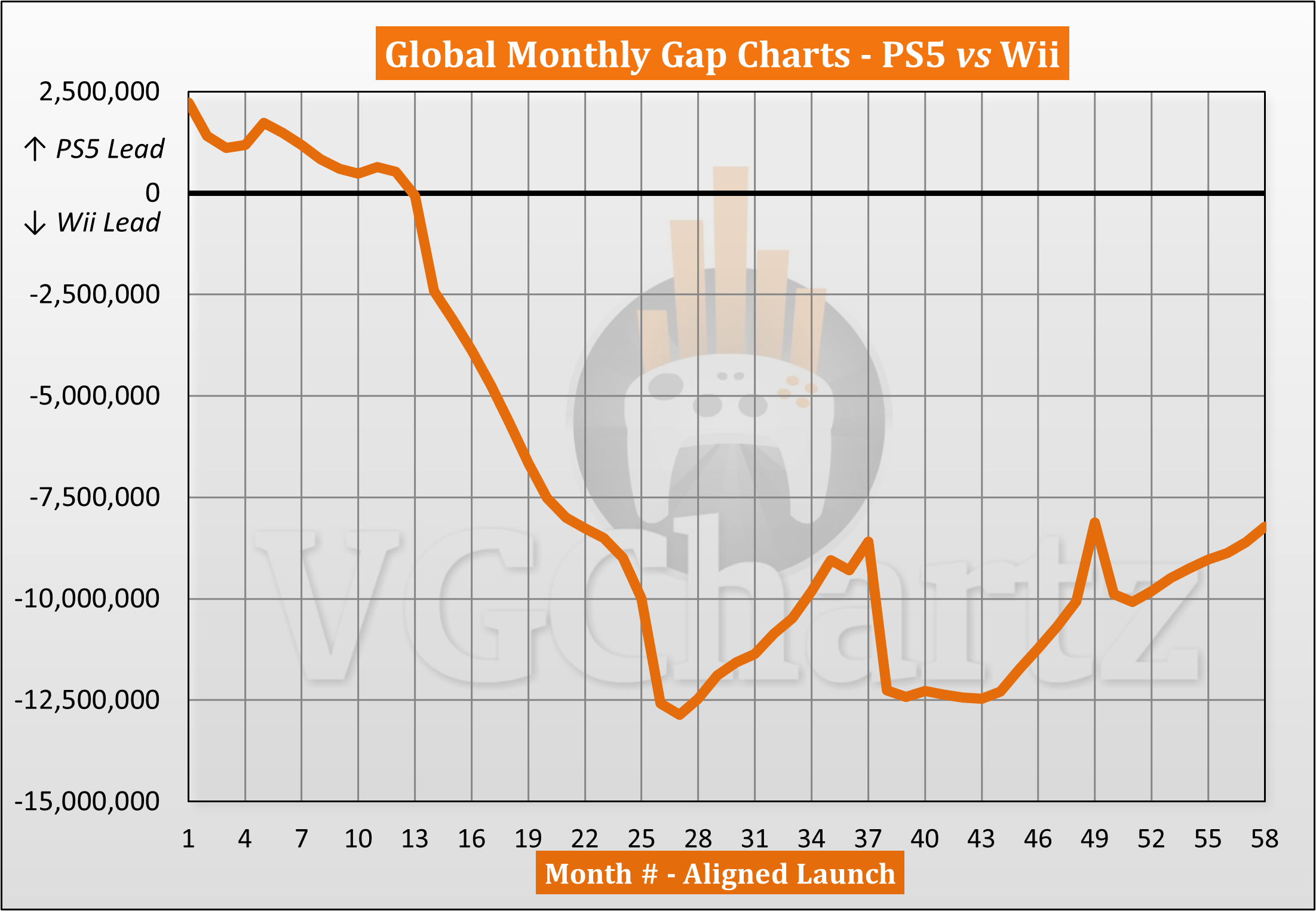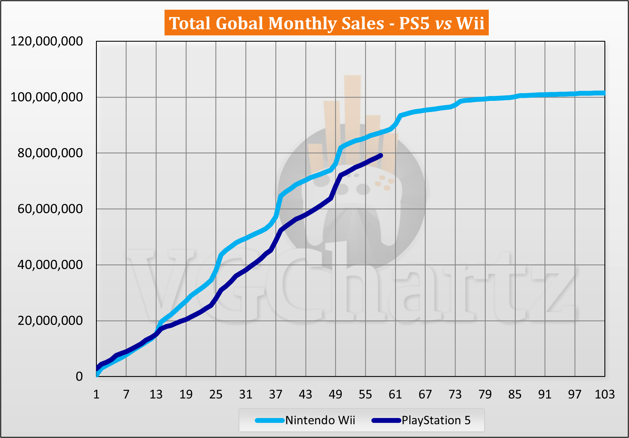 Worldwide sales of the Nintendo Wii exceeded 90 million units in month 61 and 100 million in month 85. Throughout its history, the Nintendo Wii has sold 101.63 million units. The PS5 is 22.54 million units behind the Wii's lifetime sales.