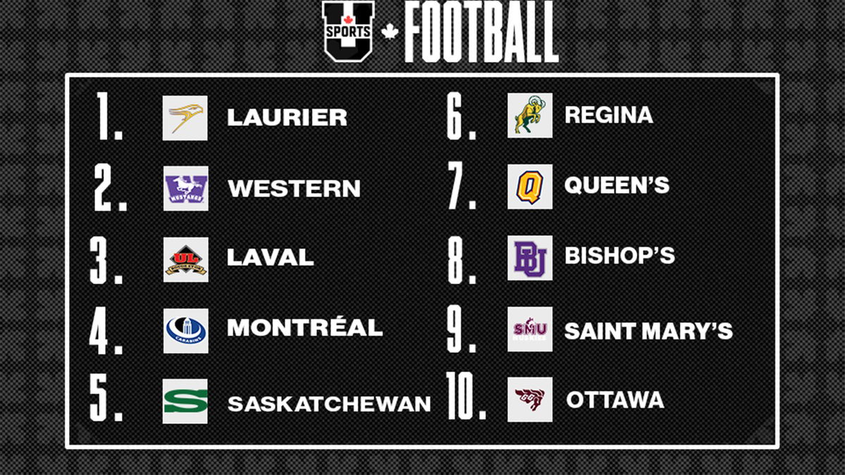 The remaining ratings remained unchanged a week ago, including Laurier Golden Hawks, Western Mustangs, Laval Rouge et or, Montreal Carabins and Haskatchewan Huskies in five.