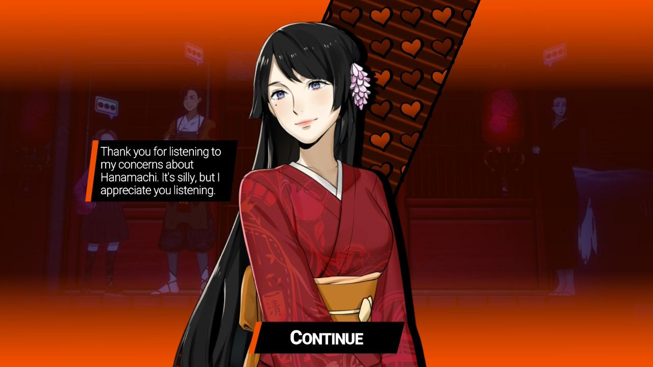 In addition to side-quests, you can engage in romantic pursuits with one of six characters. As you resolve their issues, you will unlock new costumes, more personal quips, and special bonuses that can serve you very well in your journey. Develop your relationship with Kiyo past a certain point, for example, and you'll earn a chance to reveal an enemy kana at the start of a battle.