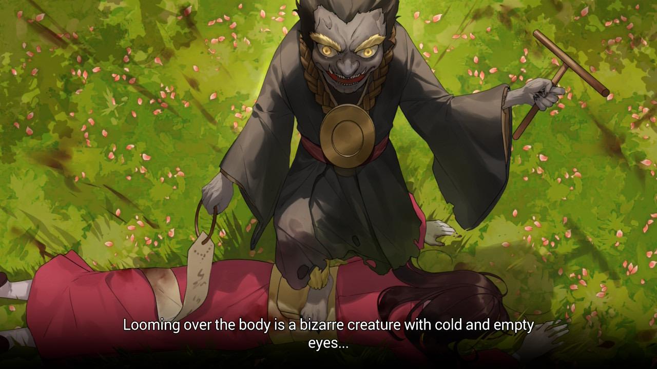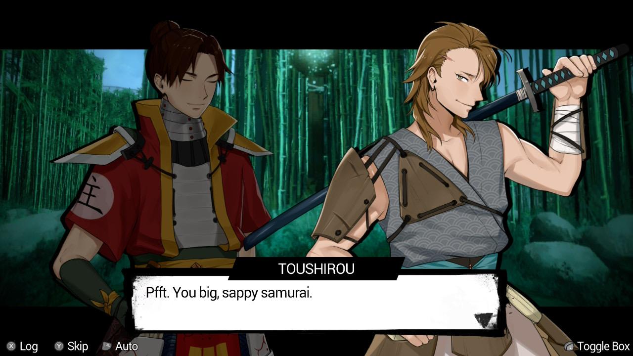Finally, I want to call attention to a small, but effective thing: the game's use of text. Depending on the conversation and the mood, certain words may be more loopy or exaggerated. In one instance, ahead of a battle with a big oni at the end of Sanrin, the letters hang off the sentence like an old screen door, as if to represent the unhinged nature of the demon. In another, when several characters are drunk, the letters collide with each other.