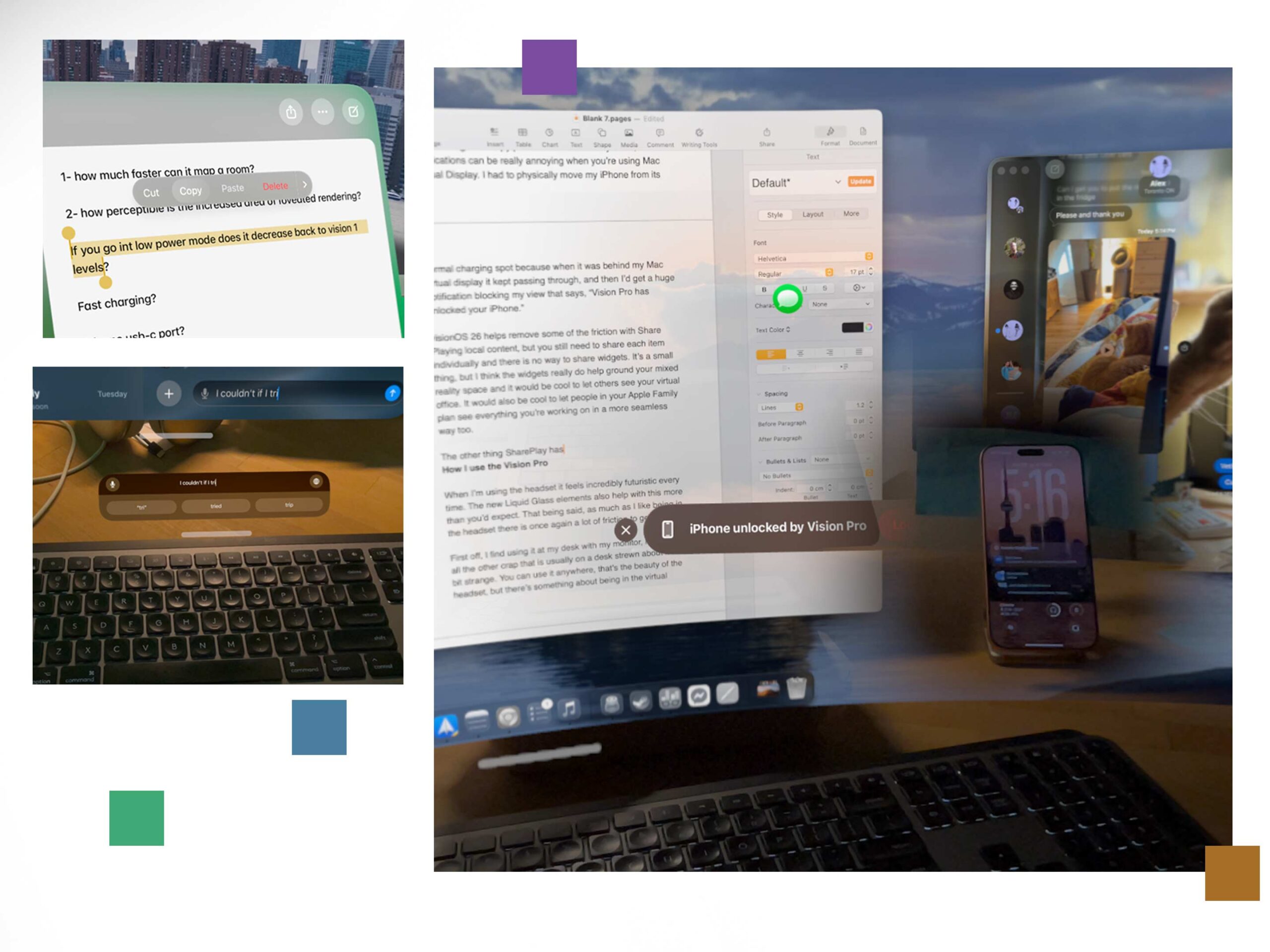 VisionOS 26 — это эффективное обновление, благодаря которому система становится менее похожей на бета-версию. Однако компании все еще необходимо найти лучший способ выполнения простых задач, таких как копирование и вставка текста, без клавиатуры. Кроме того, уведомления могут сильно раздражать при использовании Mac Virtual Display. Мне пришлось физически переместить свой iPhone из обычного места зарядки, потому что, когда он находился за виртуальным дисплеем моего Mac, он продолжал проходить сквозь него, а затем я получал огромное уведомление, блокирующее мой обзор, в котором говорилось: «Vision Pro разблокировал ваш iPhone». Затем, когда я смотрел на него, курсор моего Mac использовал Universal Control для переключения на Vision Pro, и было бы еще более неприятно найти его снова. Не поймите меня неправильно, бывают моменты, когда все это вместе работает именно так, как задумал Apple, и эти времена просто потрясающие, но в других случаях это немного беспорядочно.