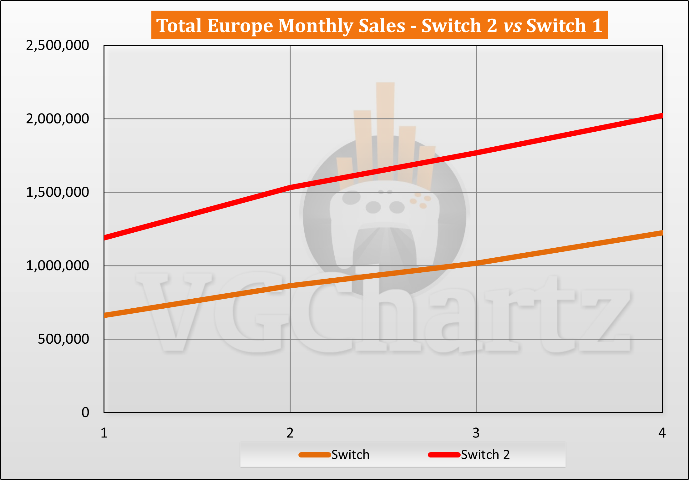 This monthly series compares sales of Nintendo Switch 2 and Nintendo Switch 1 in Europe.