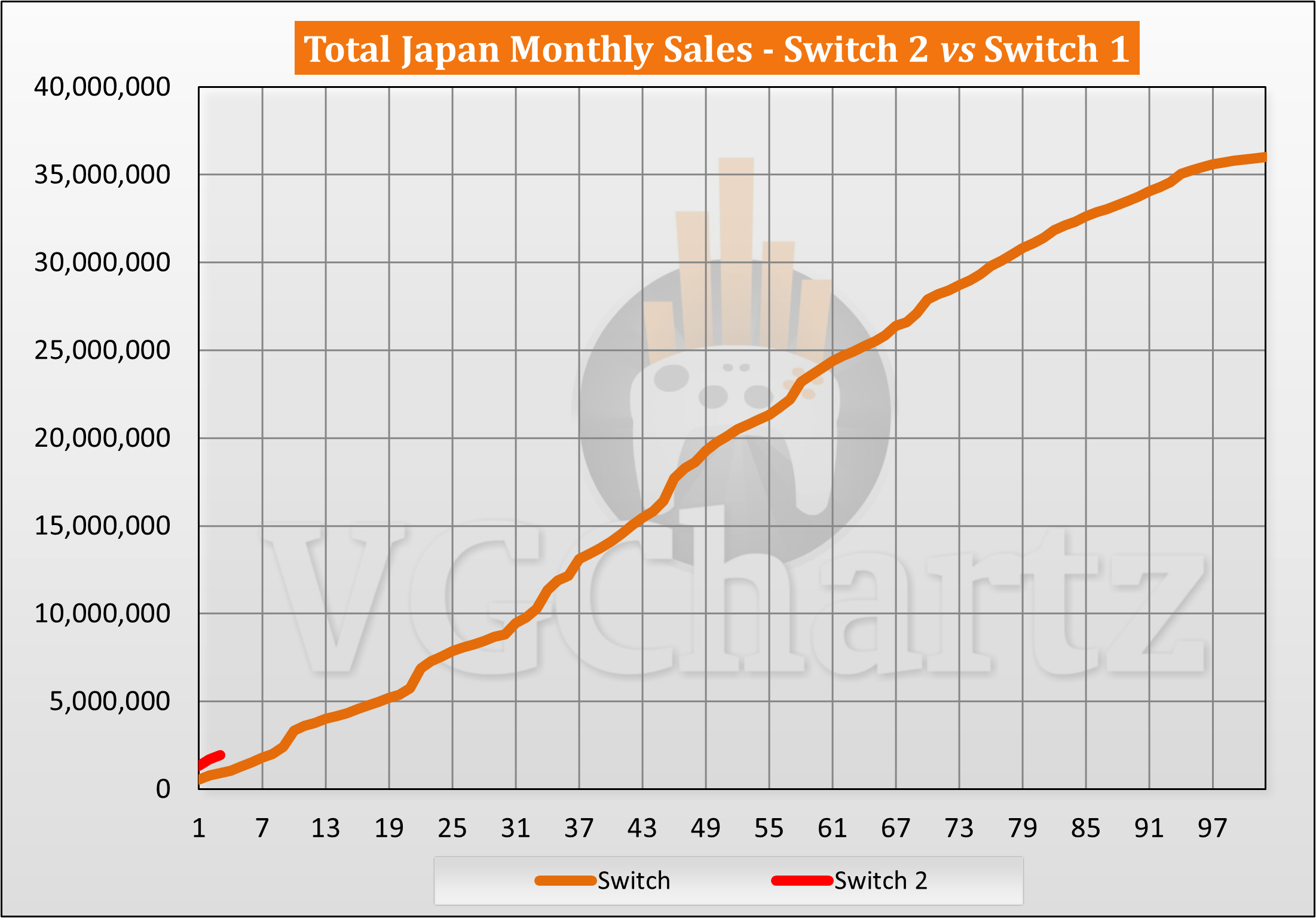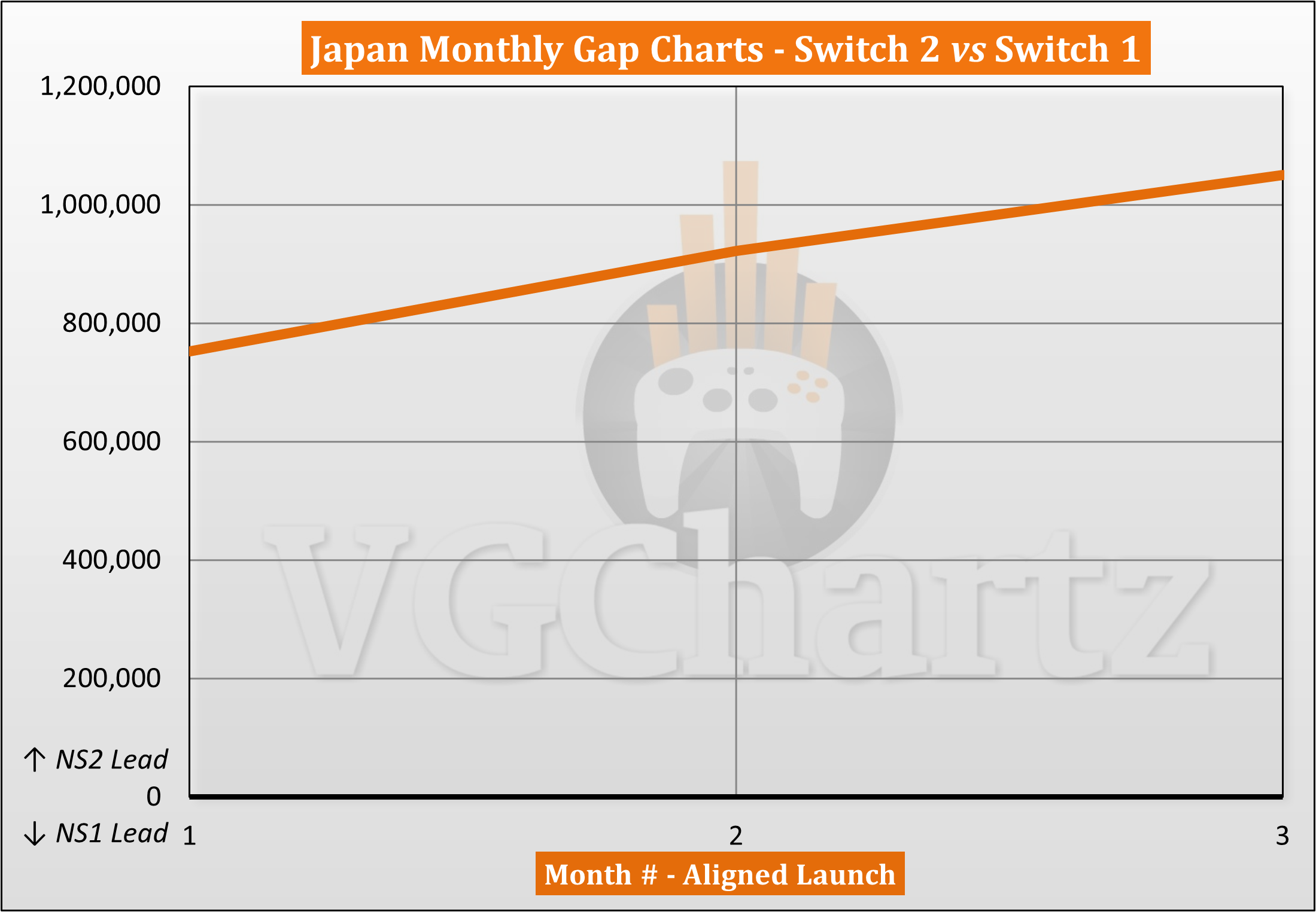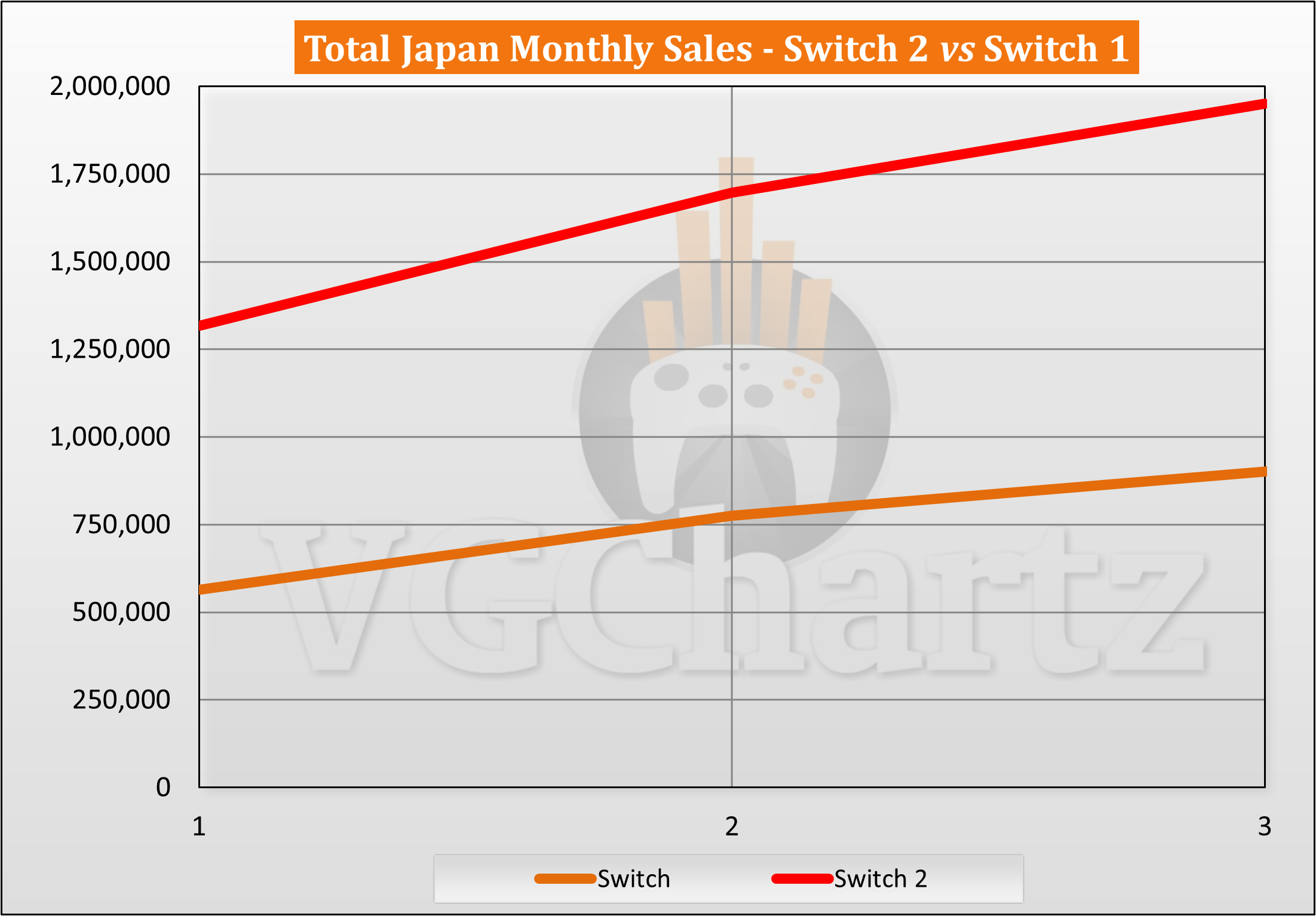 This monthly series compares aligned Japanese sales Nintendo Switch 2 and Nintendo Switch 1.