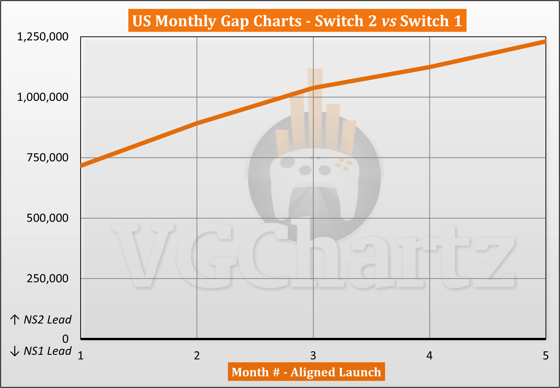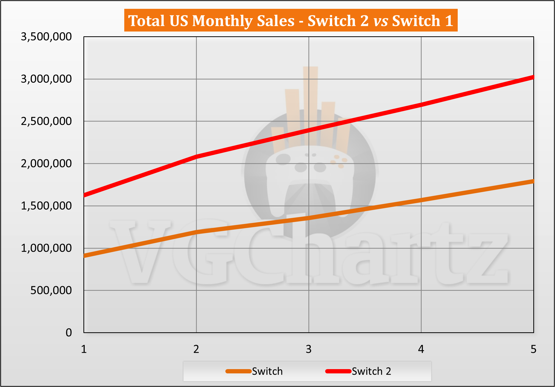 The fifth month for Switch 2 is October 2025, and for Switch 1 it is July 2017. Switch 2 sold 3.02 million units and Switch 1 sold 1.79 million units during the same period.