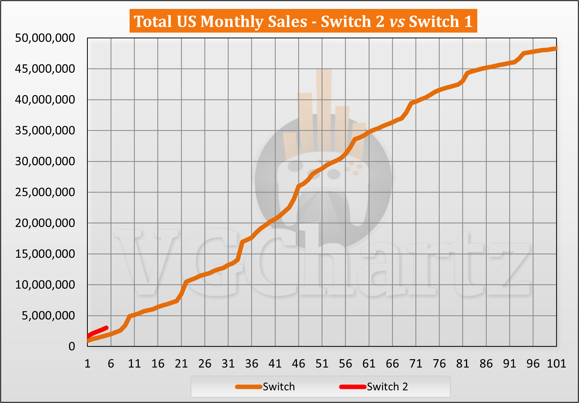 This monthly series compares sales of Nintendo Switch 2 and Nintendo Switch 1 in the United States.
