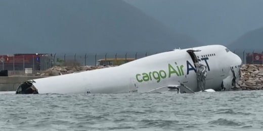 Two people died after a cargo plane skidded off the runway at Hong Kong airport