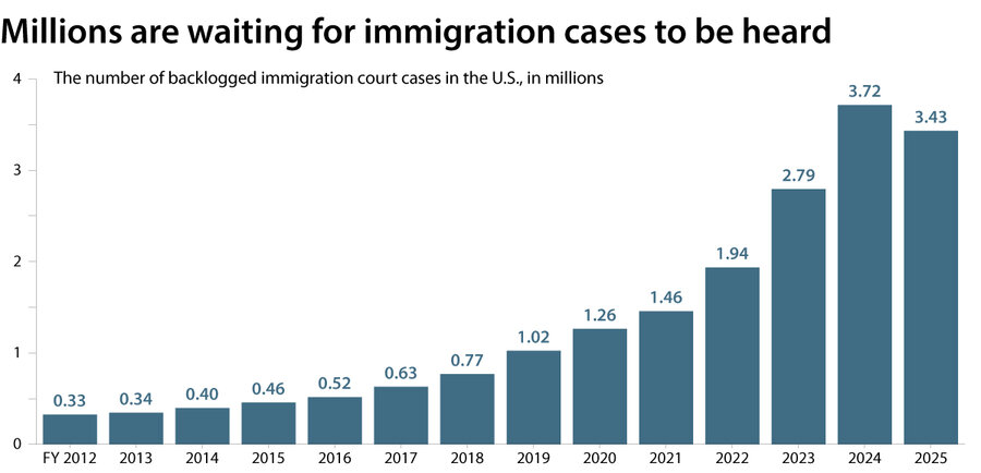 По состоянию на август было 3,4 миллиона случаев. в ожидании в иммиграционных судах. Отставание часто приводит к многолетнему ожиданию слушаний, что вызывает разочарование как у сторонников правоприменения, так и у сторонников иммигрантов.