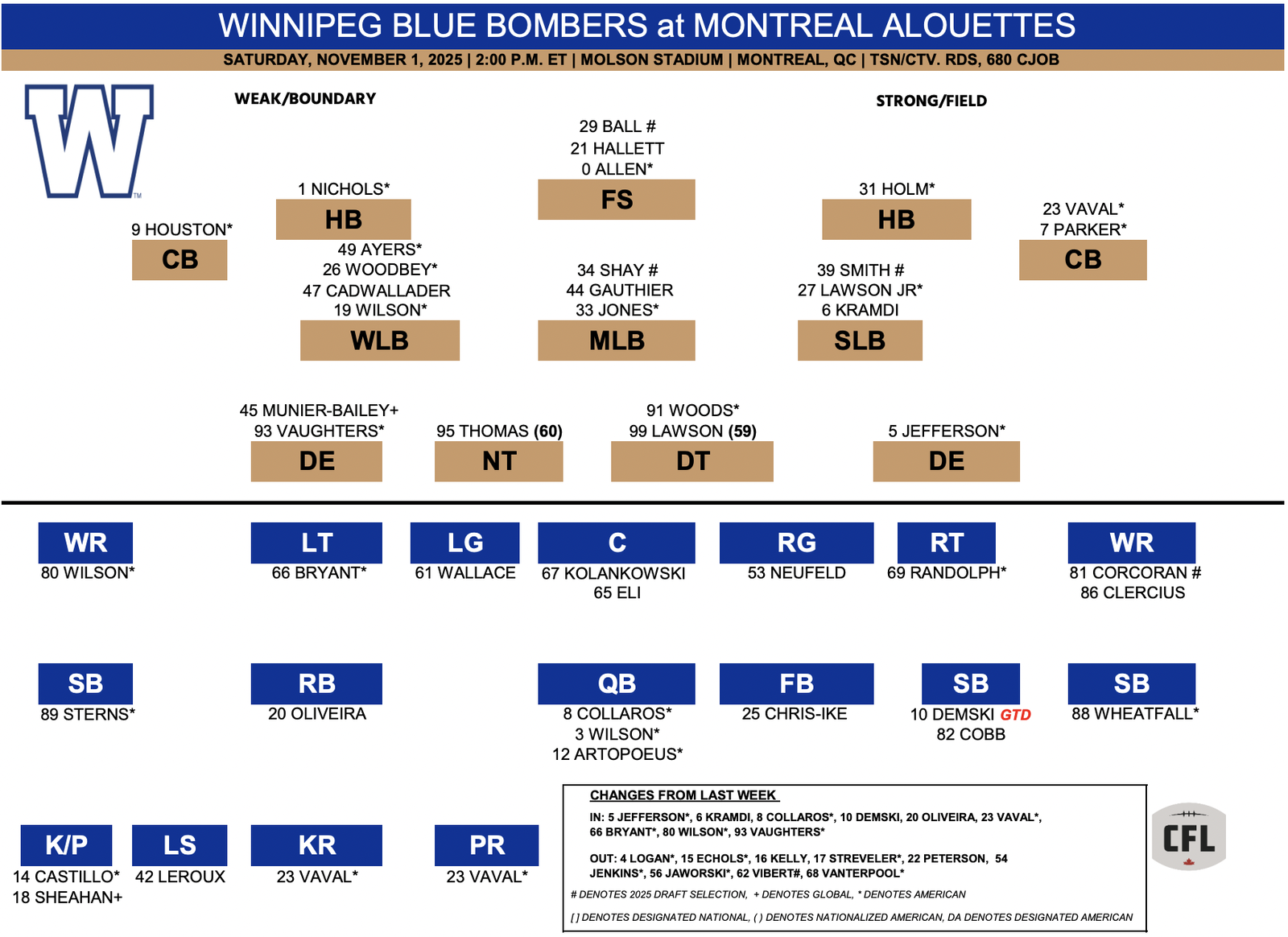 The Blue Bombers also made one change to their starting lineup, with Joey Corcoran listed as the starting wide receiver over Kevens Clercius.
